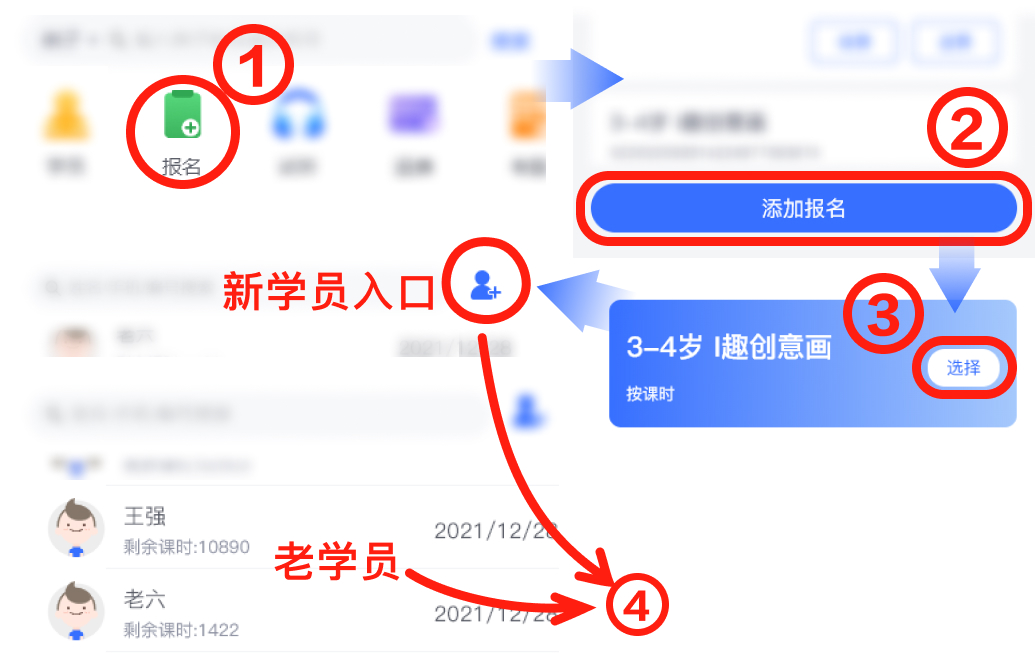 4.选择列表中需要报名的学员,若学员为系统中未记录的新学员,则点击右上角图标添加学员。