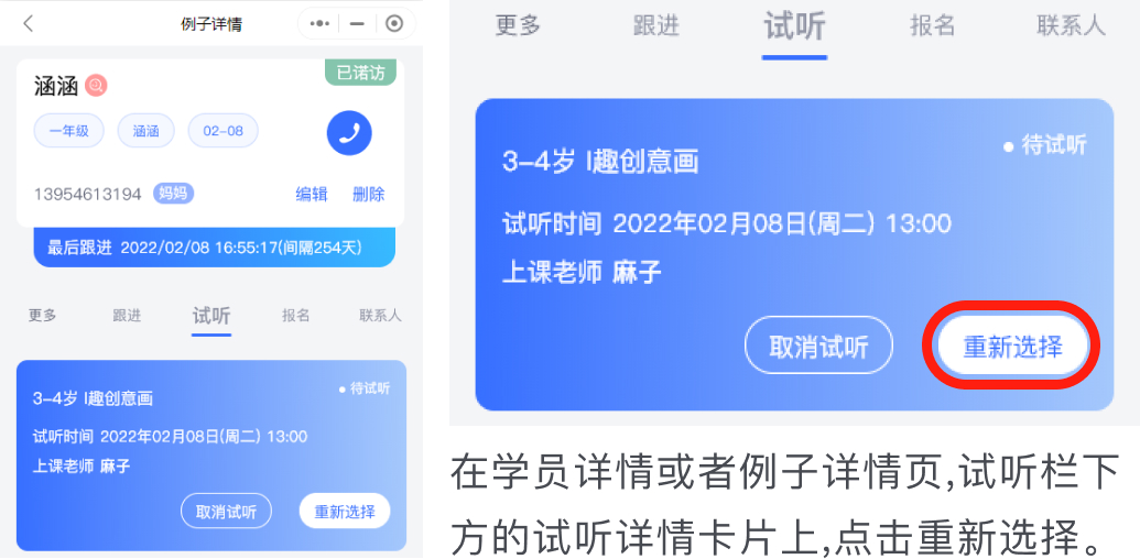 重新选择试听,可以在学员详情与例子详情操作。